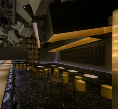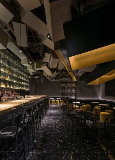 At Flask’s first iteration, a converted Coke vending machine fitted with a concealed door proved a much-loved gateway between storefront concept and bar. For its proud encore, Flask 2.0 takes a more futuristic approach, designed with impact in mind. Guests access the space via a hidden revolving door. Inside, an extended tunnel of reflective black glass, lit by neon strips and highlighted with brass accents create an infinity effect. Moody and dark, it quite literally transports visitors to an altogether different environment.