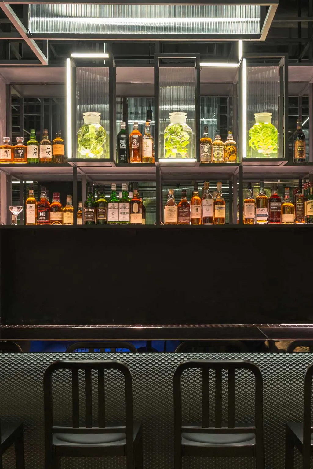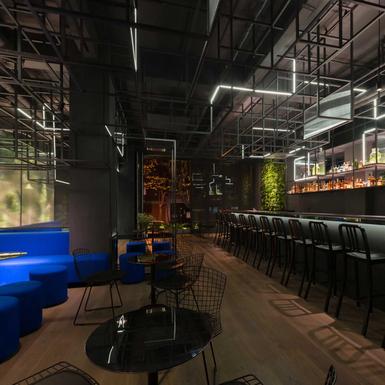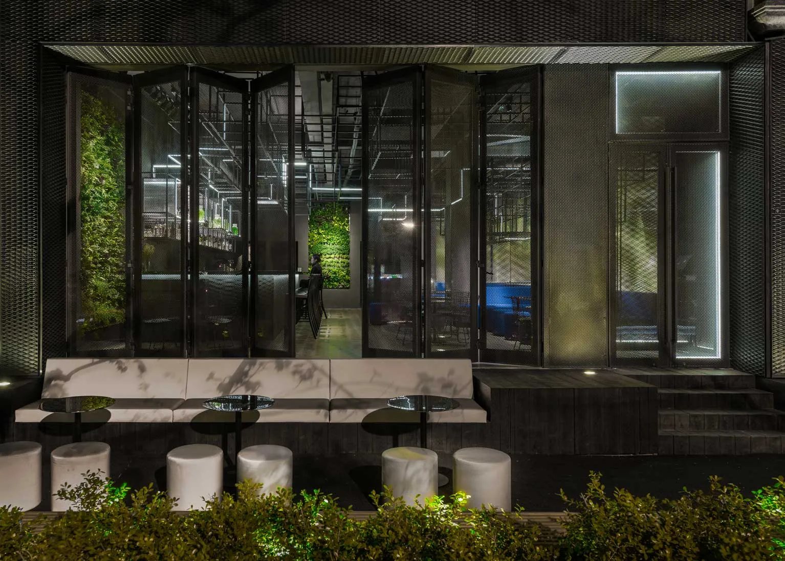 In keeping with Botanist’s design goal of drawing patrons into both concept and space, its key themes are made visible from the street outside. Screens of meshed metal spanning the venue’s façade partially reveal its interior to create a sense of intrigue and prompt curiosity. Meanwhile, an entrance flanked by neon strips guide guests inside the space.