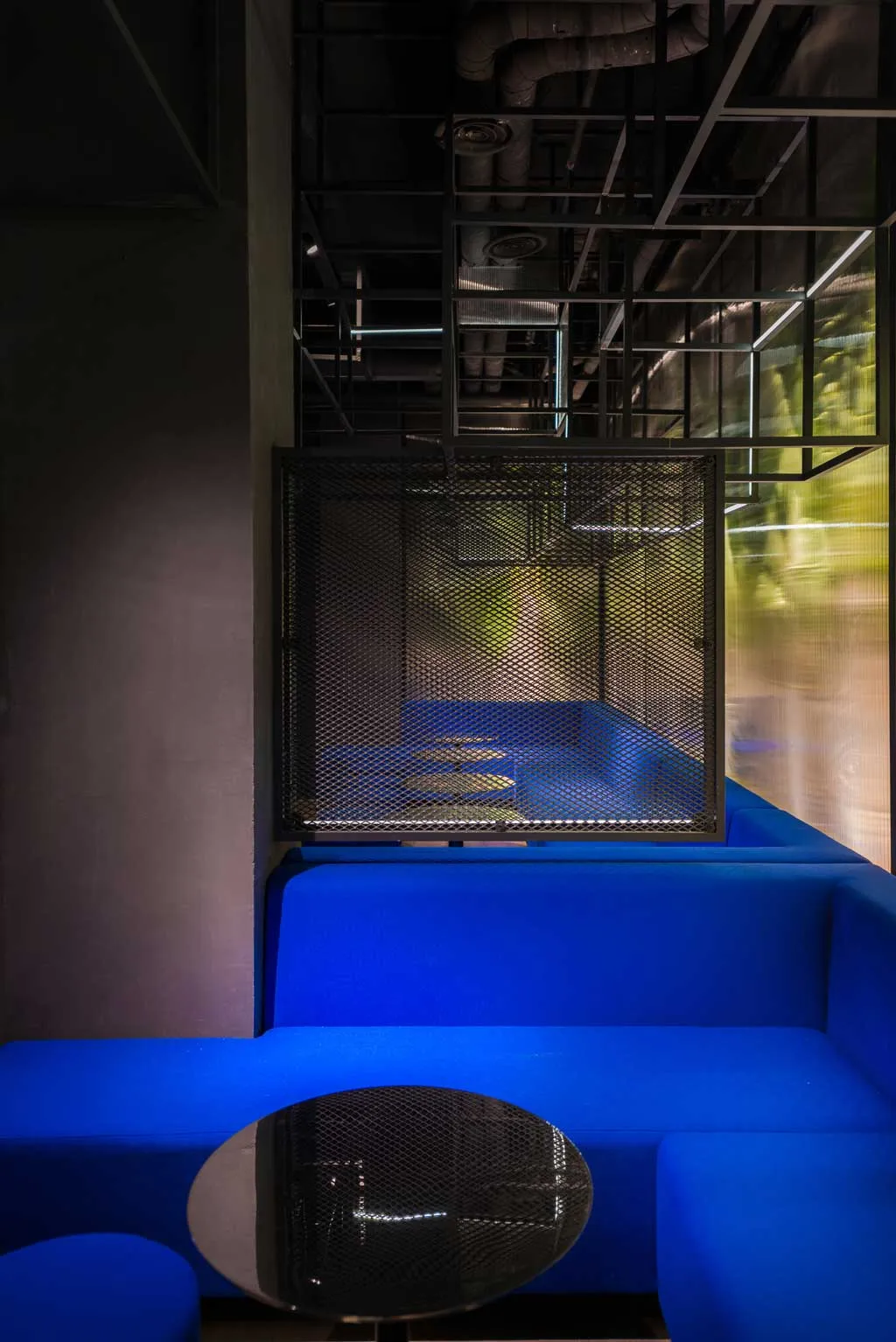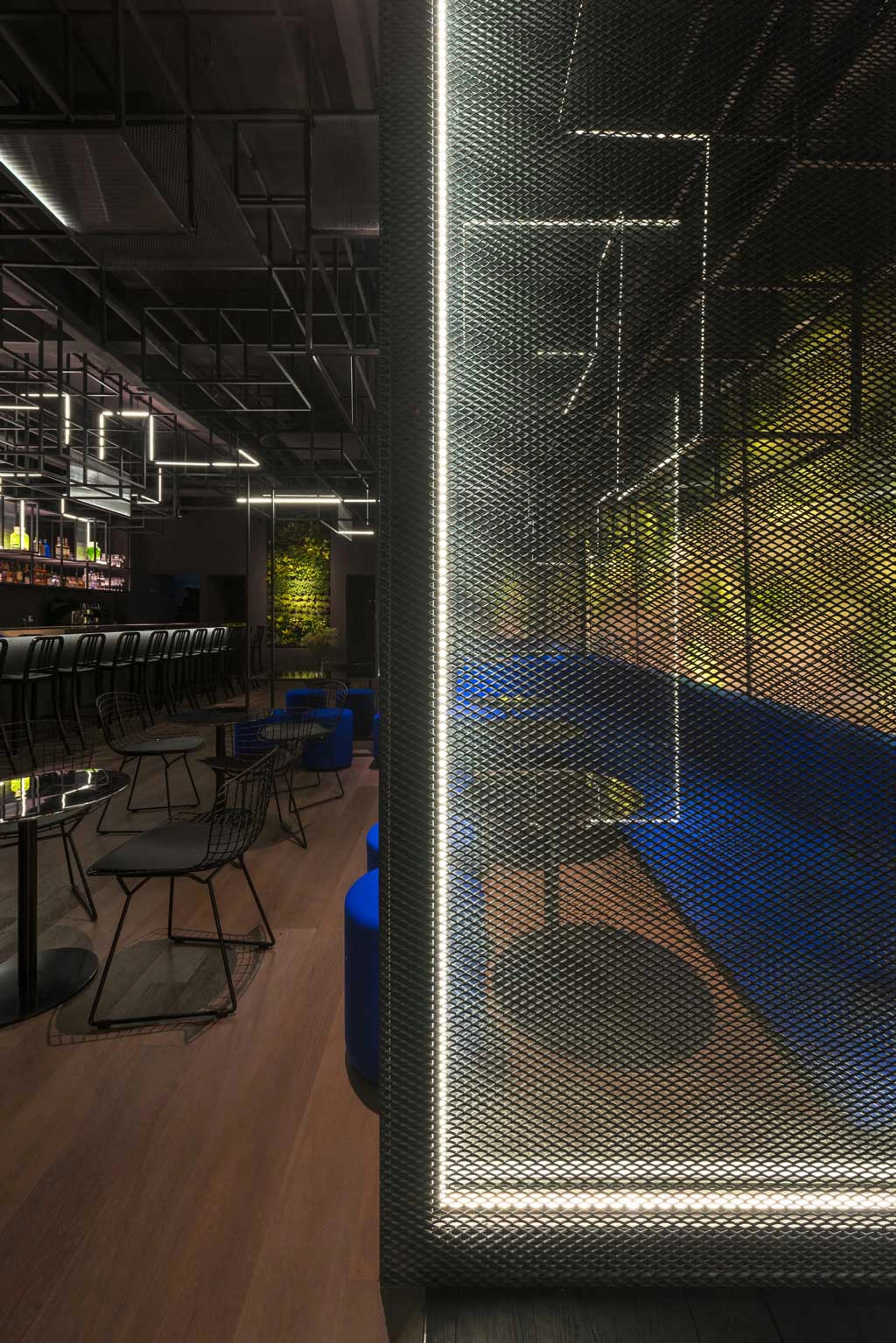 To create intimacy, distinct seating areas were created through the addition of permeable metal meshes and light strips. The partitions lend a degree of privacy, without compromising openness.