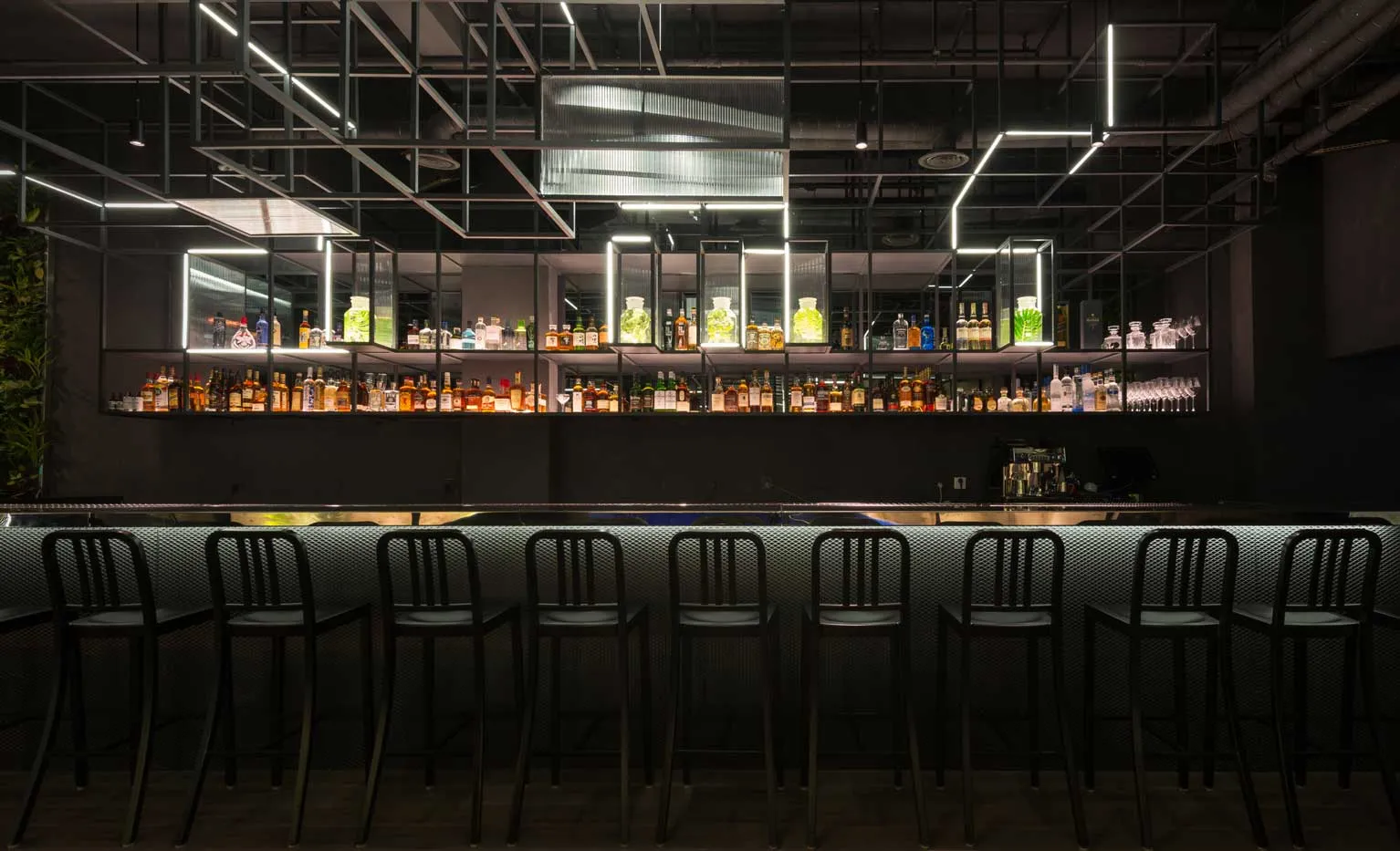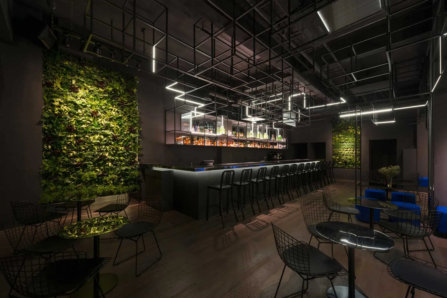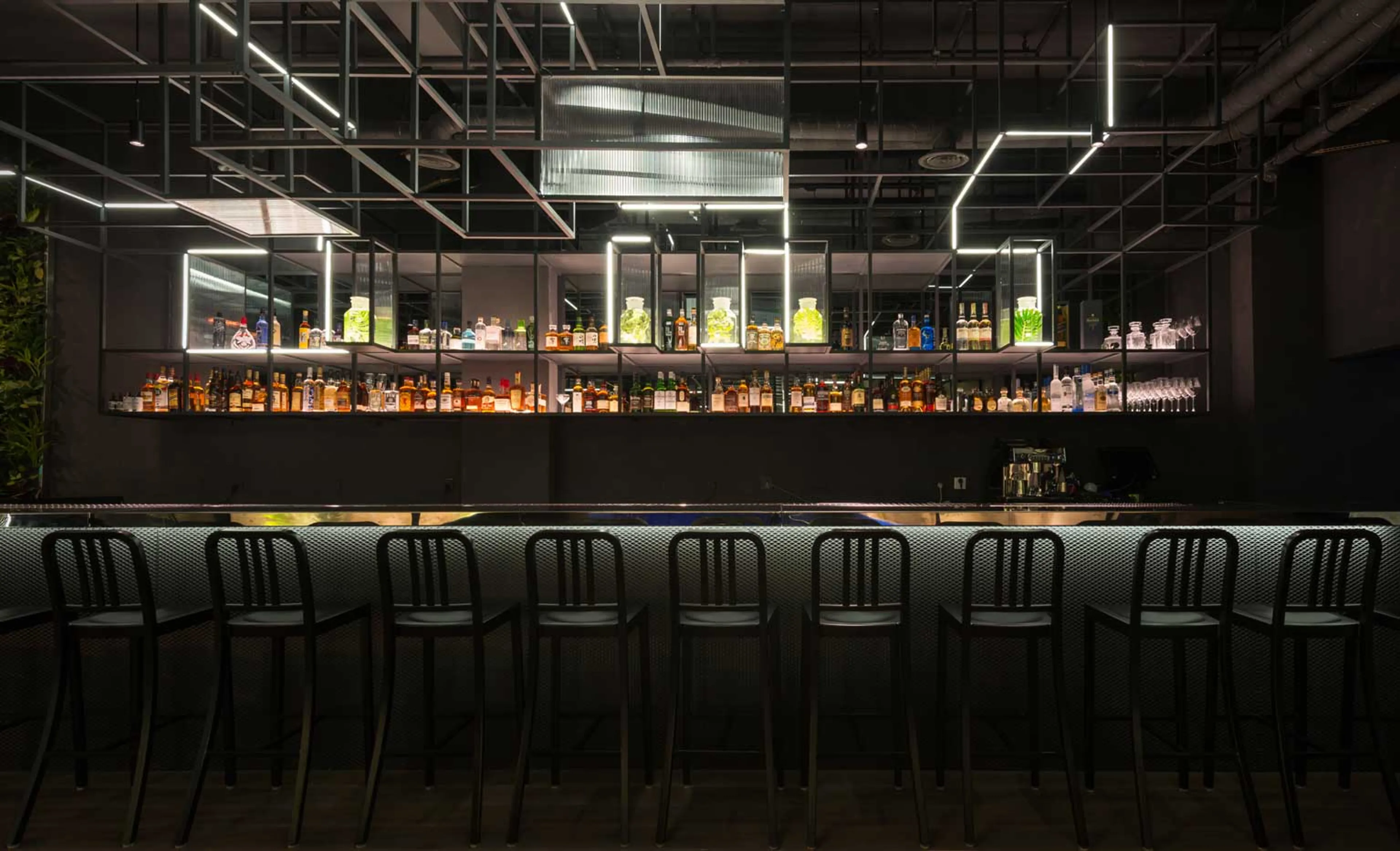 To maximise the contrast, angular and synthetic components feature throughout the space. Most dramatic of all is an immersive drop ceiling, a complex floating maze inspired by chemical structures. The irregular yet geometric frames evoke a synthetic forest of hi-tech connotations where dark metal structures, strip lights, reflective panels and meshes come together to create semi futuristic aesthetics.