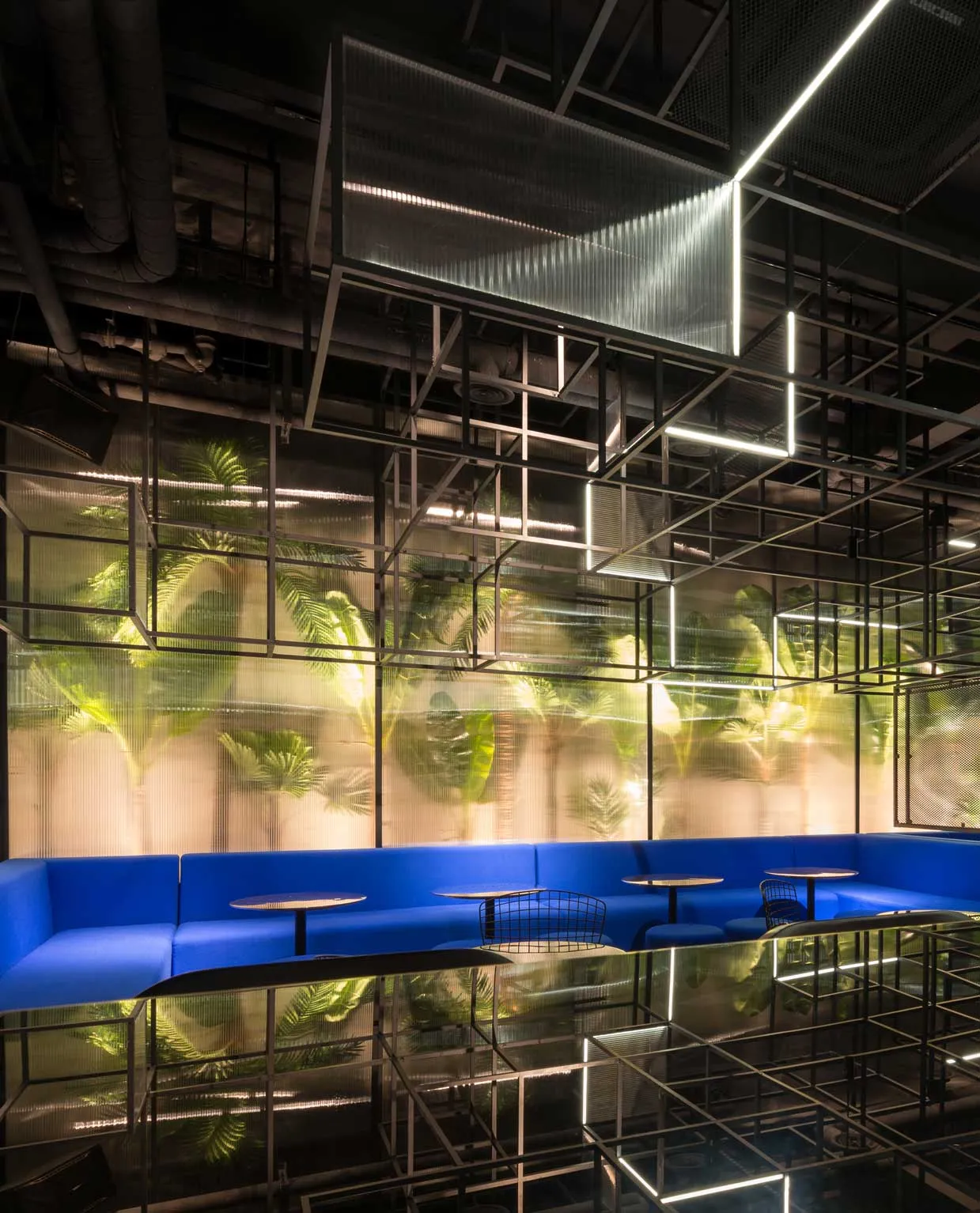 Sofas and poufs feature a deep blue colour to add vibrancy while assorted lighting spanning varied sources and tones lend a dramatic glow to specific areas. The most prominent of these is a cluster of strip lights along the ceiling maze diffusing light subtly from above. Another dominant source is concealed behind the polycarbonate wall installation.