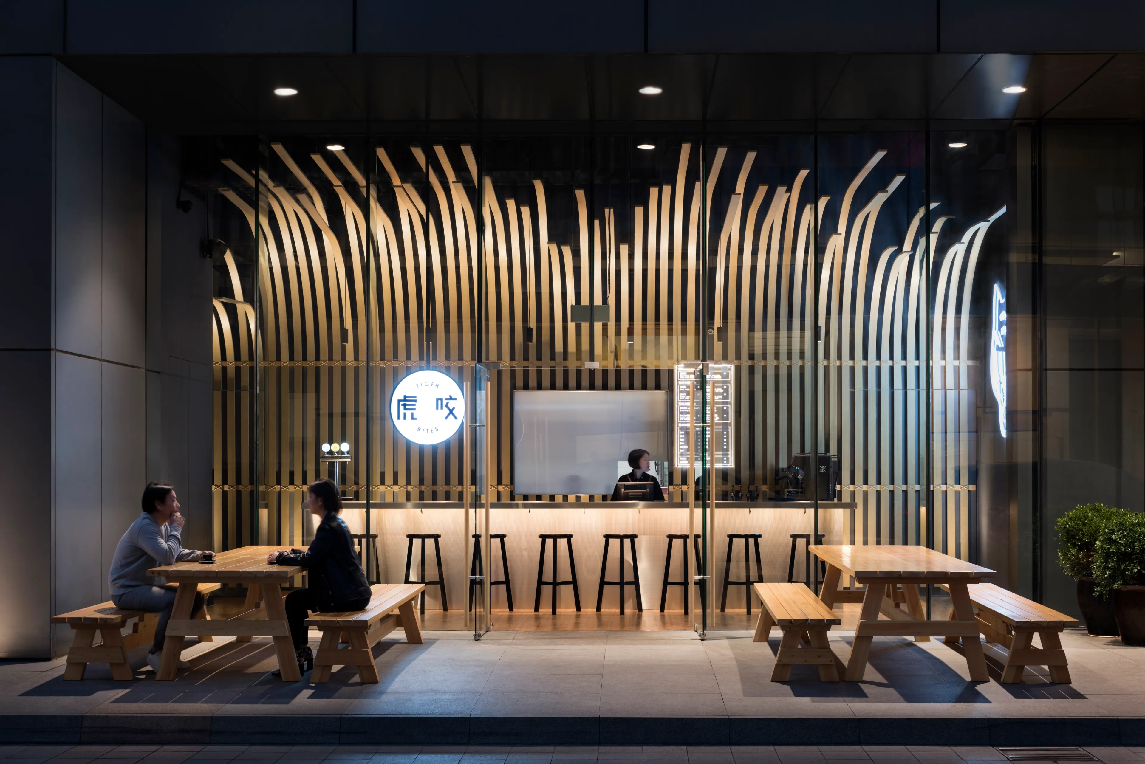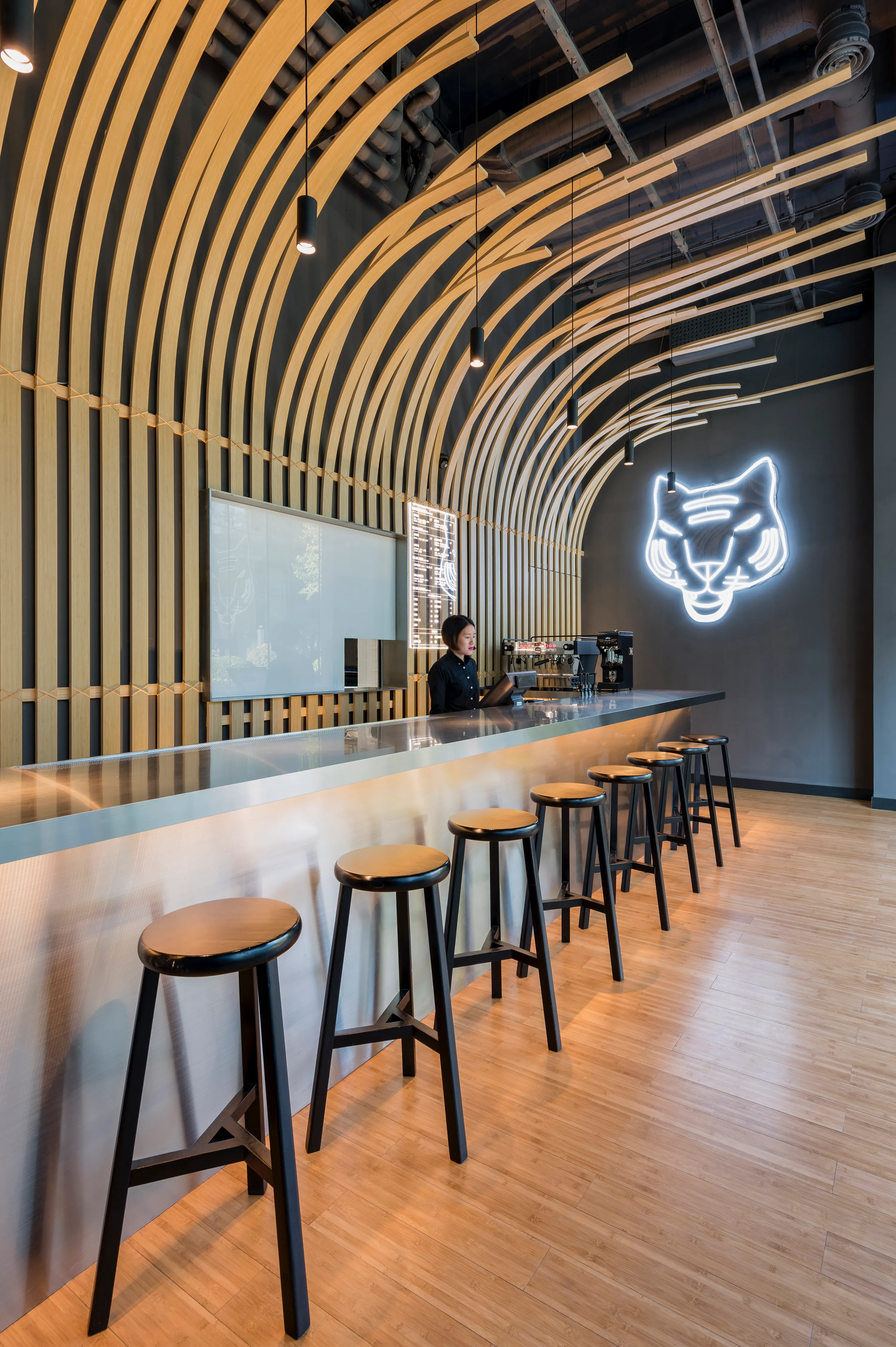 The theme continues inside the space, where vaulted bamboo strips frame the restaurant’s service counter to resemble the wooden bands of the traditional steamers so integral to Taiwanese cooking. Illuminated by both ceiling and floor lighting, it makes for a striking centerpiece to the space. An altogether edgier installation sees a neon tiger face, apparently chomping its mouth, for an eminently shareable feature.