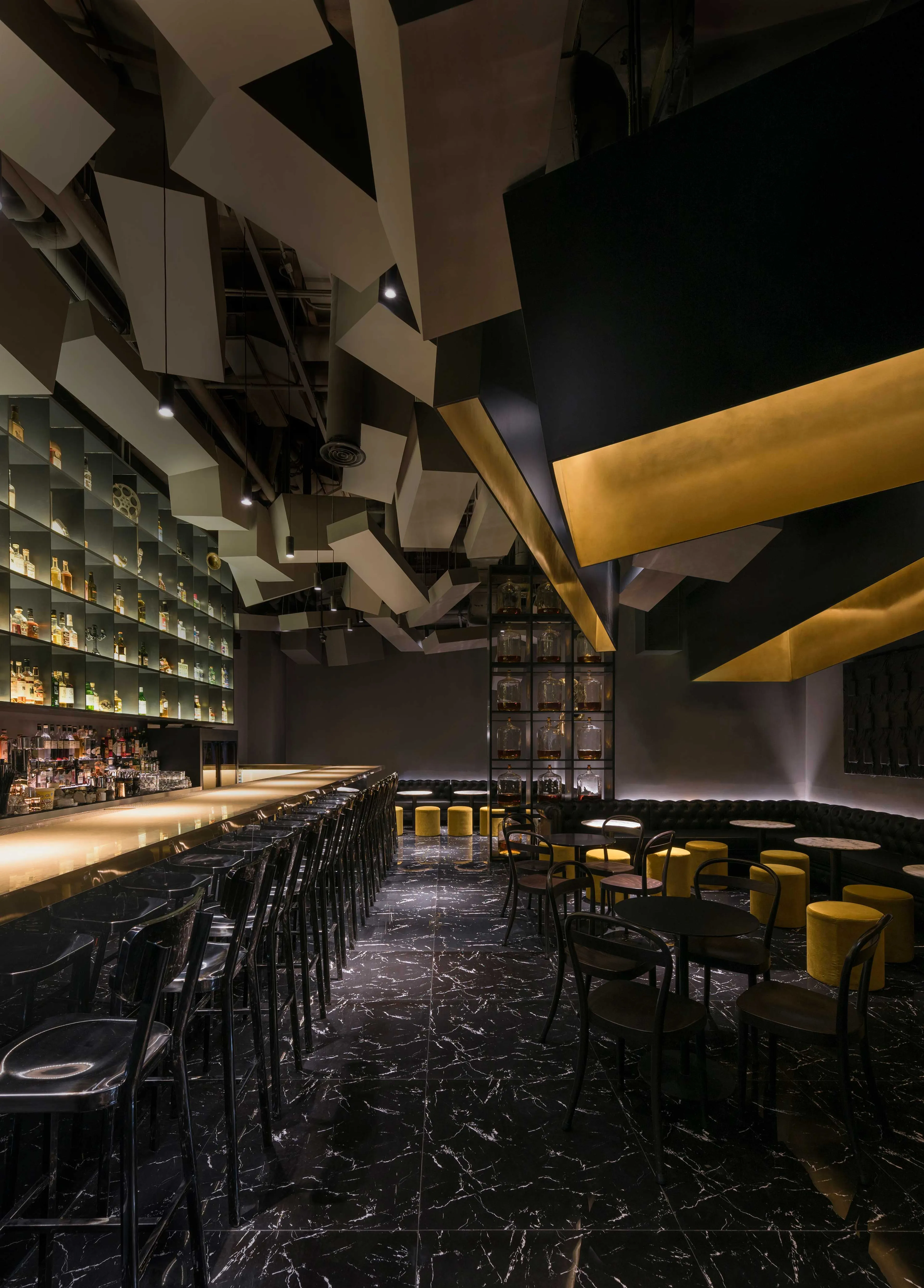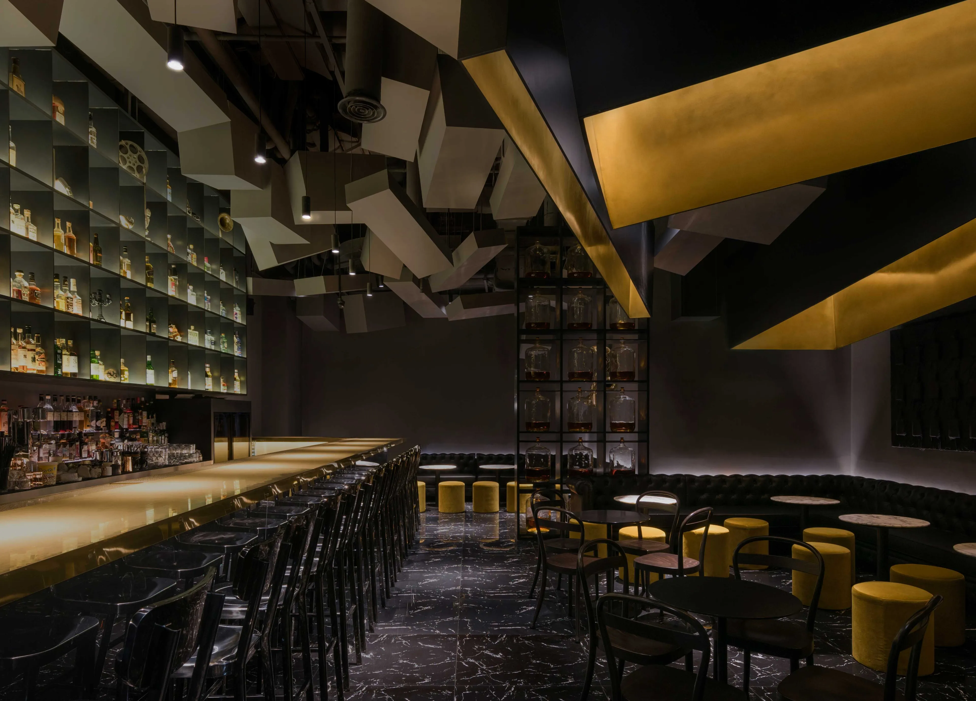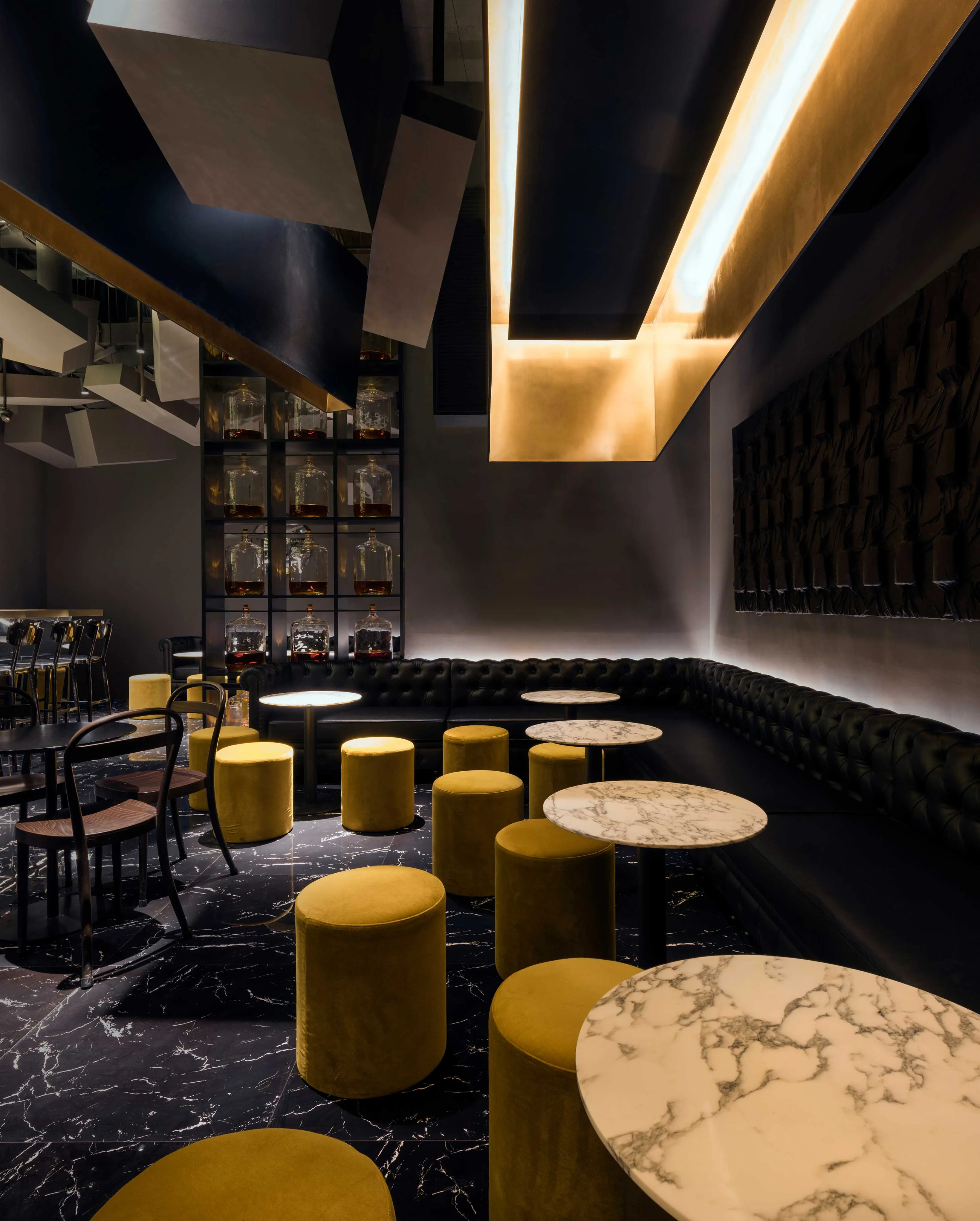 Elegant, luxurious, and evocative of the first Flask, this new venue elevates familiar tropes of a classic speakeasy to striking effect. Comfortable Chester sofas, gold chenille poufs, and marble-topped tables implore guests to relax and unwind into an evening of expertly mixed drinks, selected from an elaborate ceiling-height display of liquor bottles. Low-lit and indulgent, the space maintains a unique, contemporary edge by way of a huge golden light fixture diffusing subtle light from above.