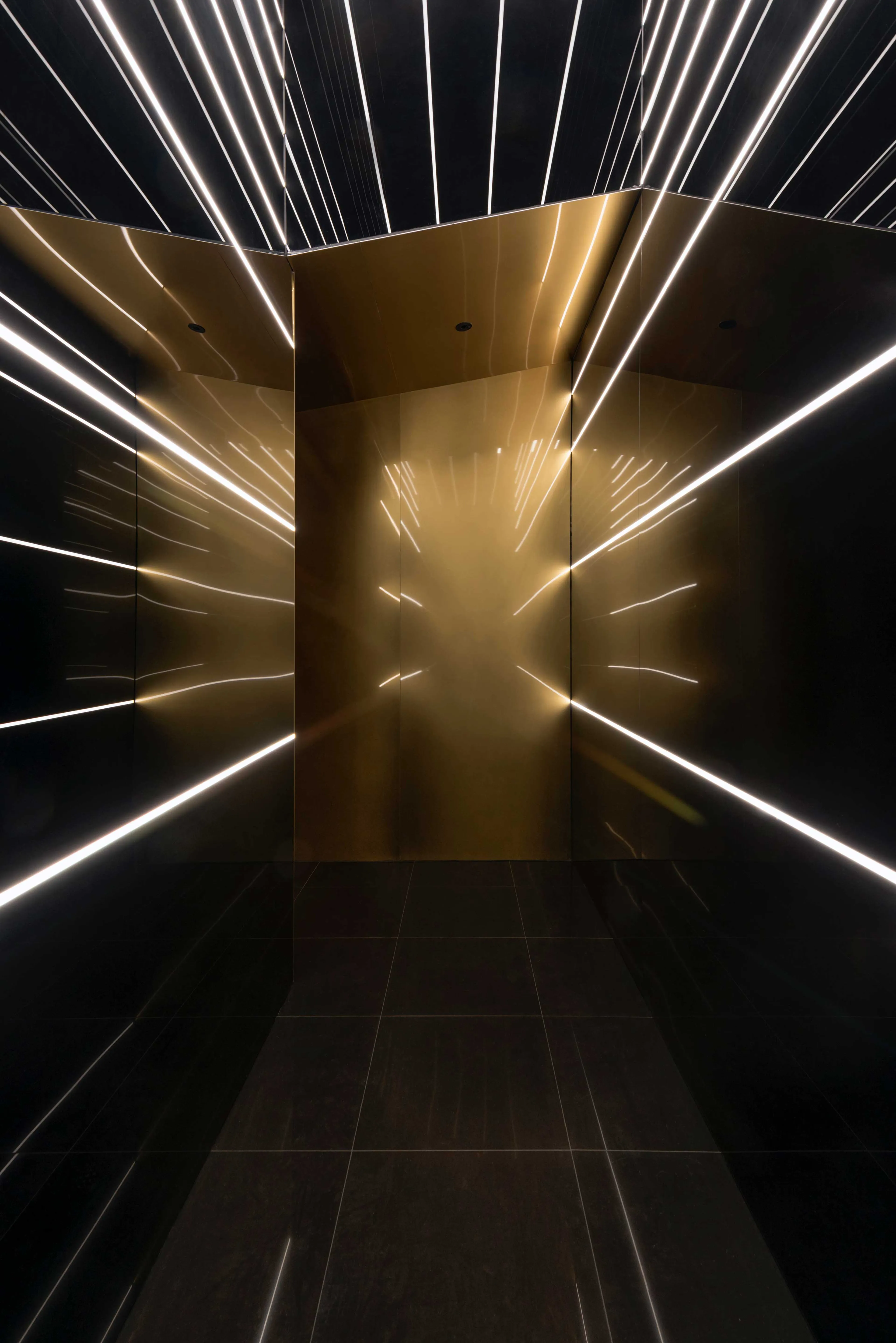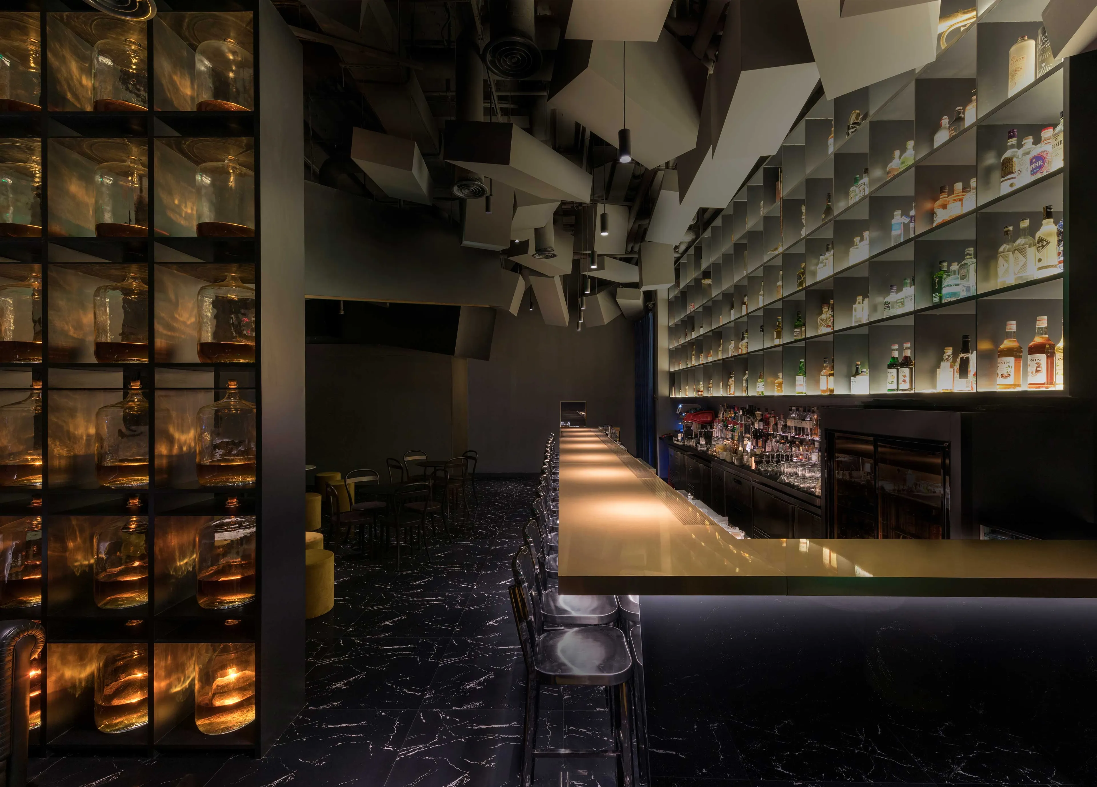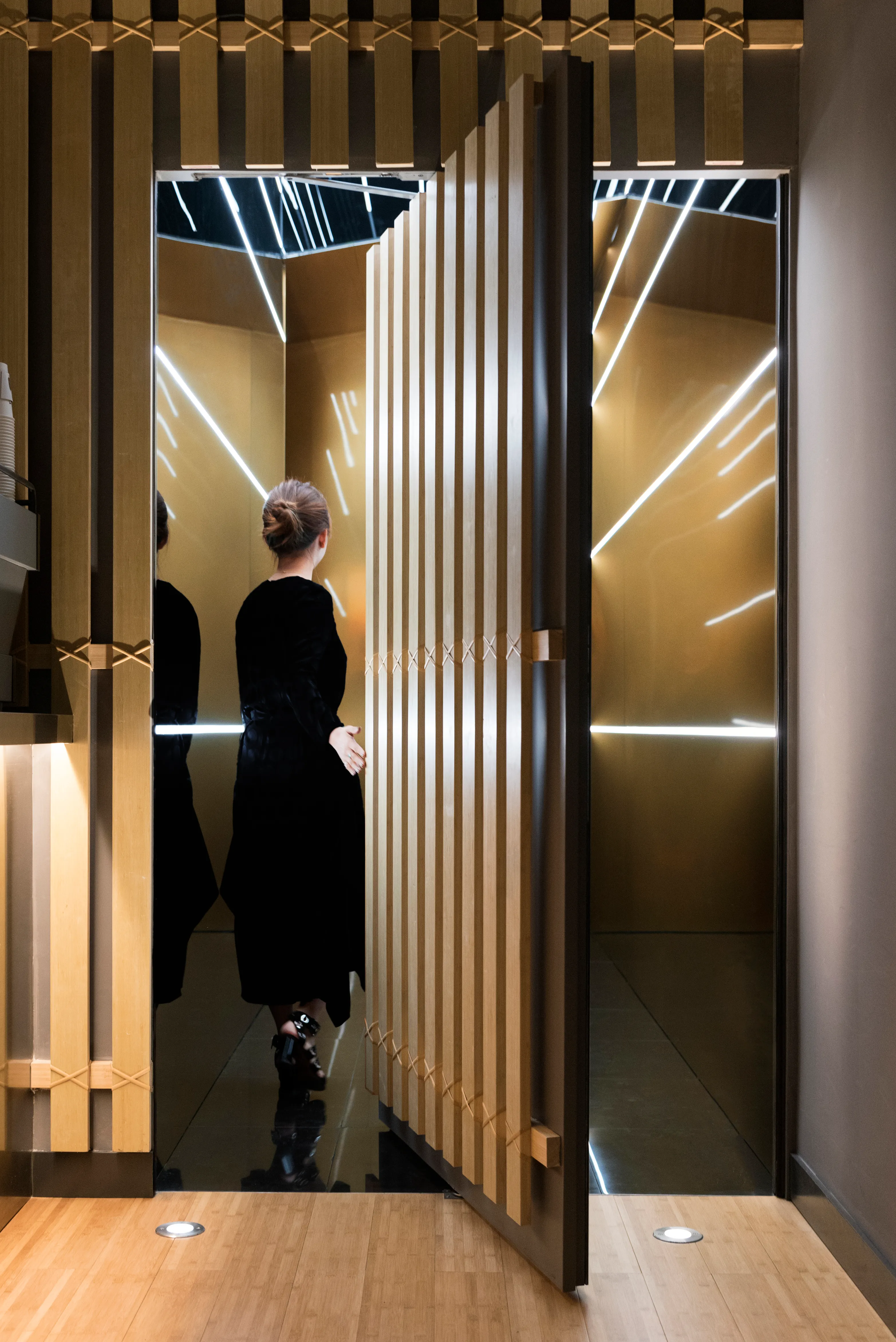 At Flask’s first iteration, a converted Coke vending machine fitted with a concealed door proved a much-loved gateway between storefront concept and bar. For its proud encore, Flask 2.0 takes a more futuristic approach, designed with impact in mind. Guests access the space via a hidden revolving door. Inside, an extended tunnel of reflective black glass, lit by neon strips and highlighted with brass accents create an infinity effect. Moody and dark, it quite literally transports visitors to an altogether different environment.