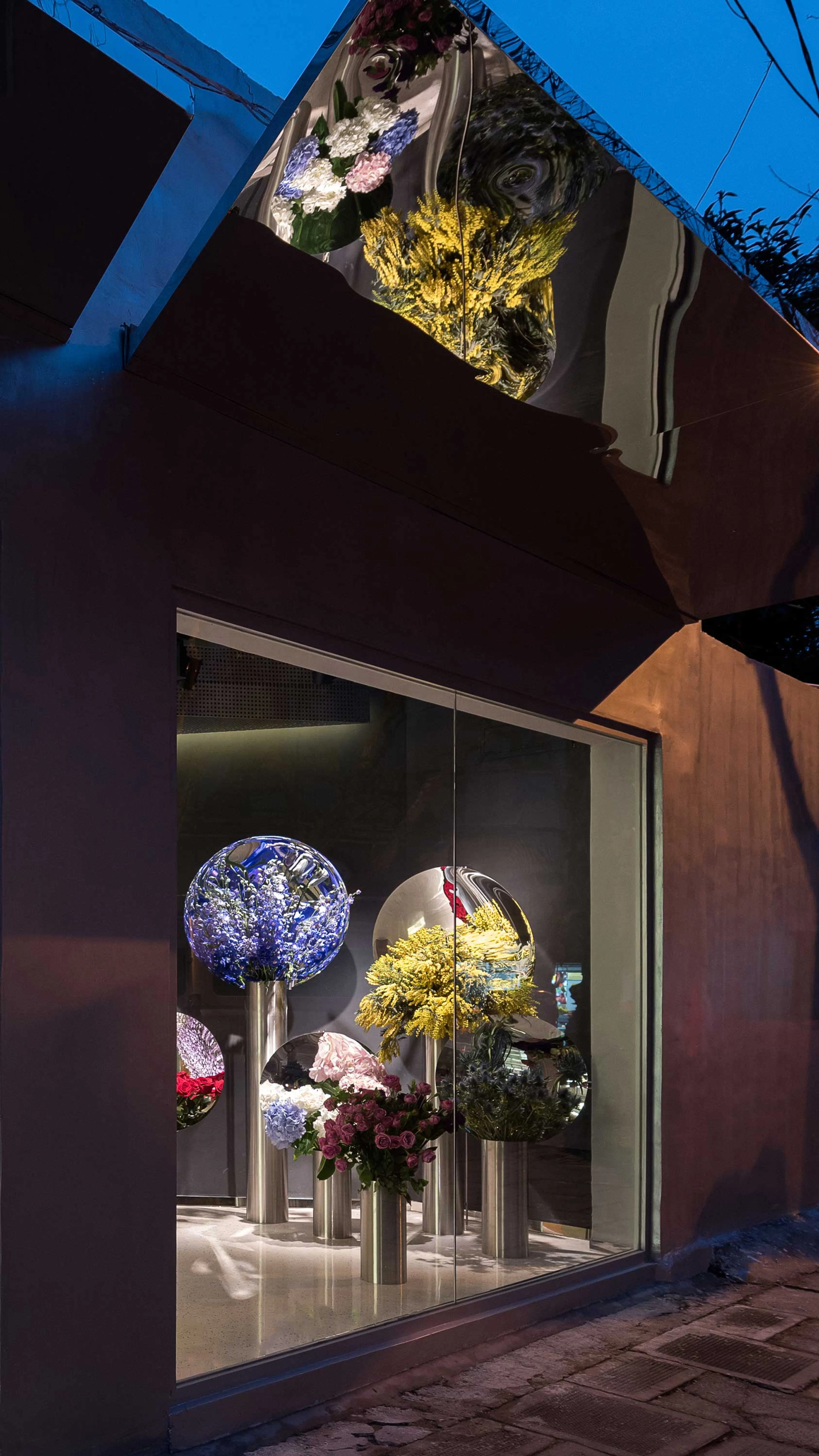 It is not just the interior of July’s Flowers that seeks to disrupt the relationship between conventional and contemporary, but also its facade. In stark contrast with its traditional residential environs, a polished metallic finish draws attention, shifting according to the angle at which it’s viewed. At the same time, indoor mirrors seemingly push themselves out of the building, bouncing both natural and artificial light, all serving to create an enticing and inviting storefront.