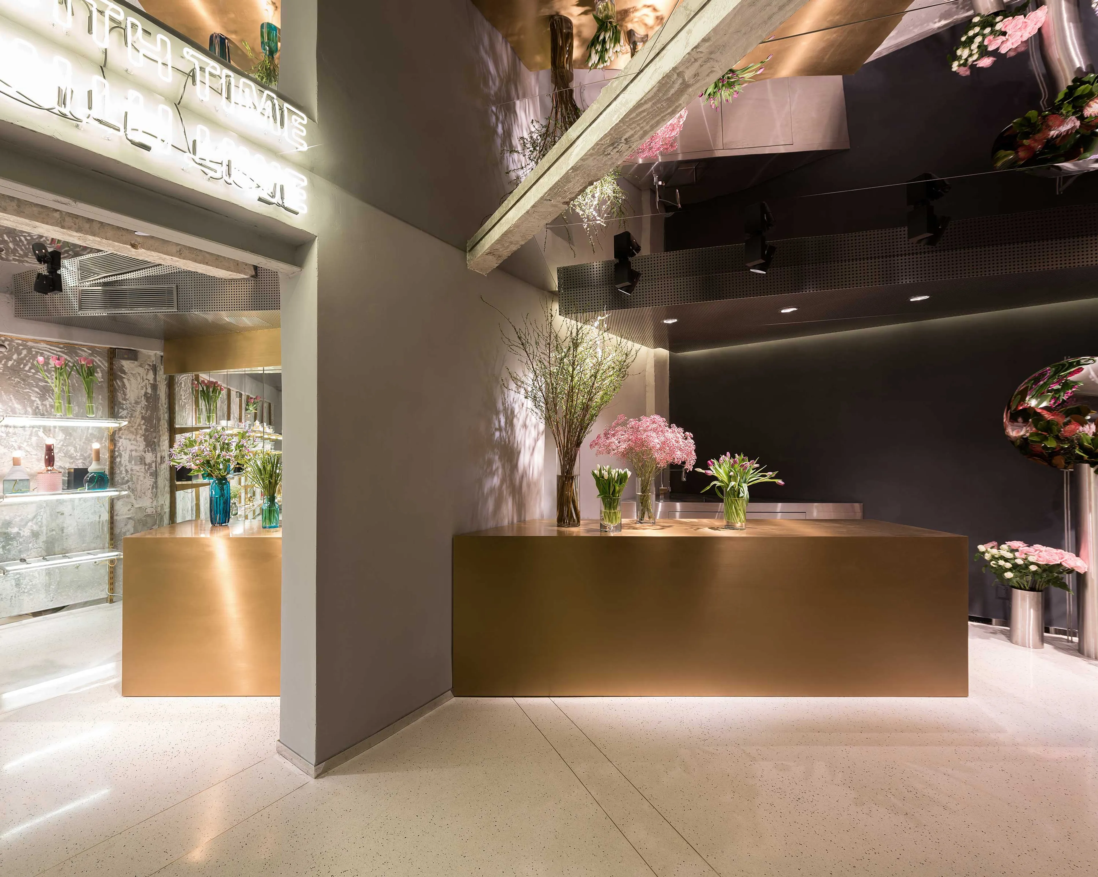 A designated showroom area presents a selection of flower-related products, as well as a curated selection of design pieces. Built on brilliance and transparency, the display quite literally glitters against the store’s raw concrete background.